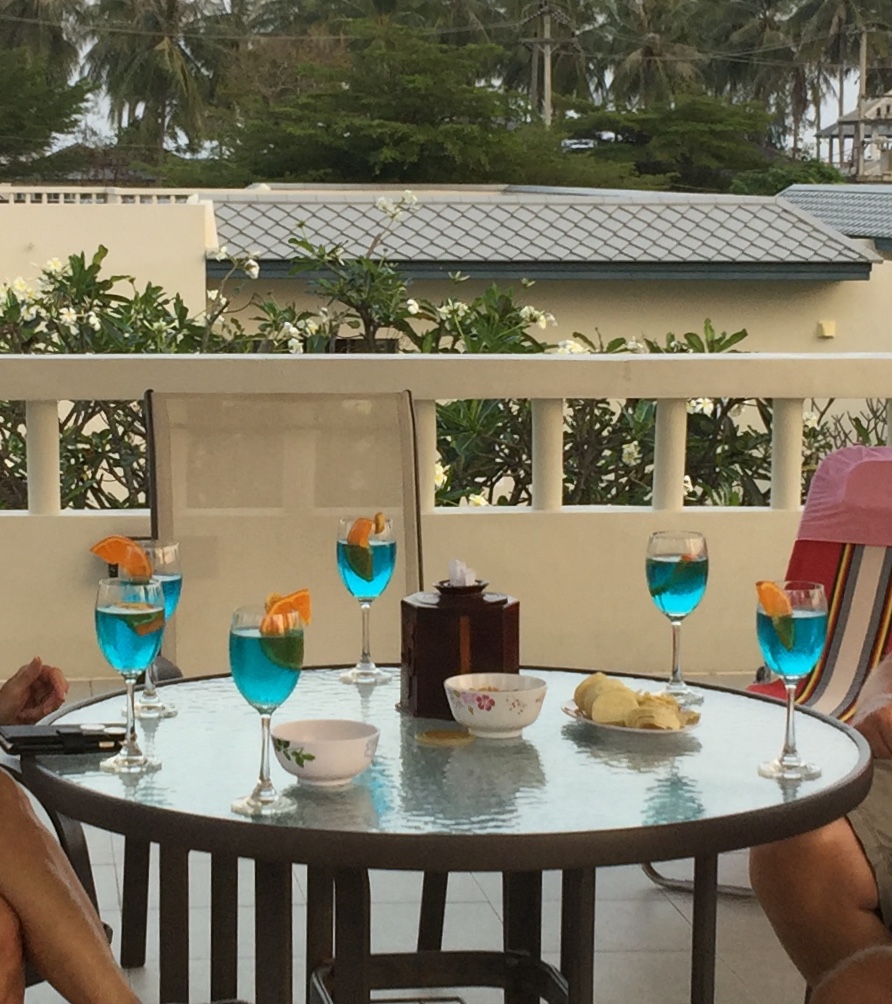I alla fall åkte Jan och Eva, Tord och Lena hem till Sverige i måndags och de kunde landa och ta sig hem till Uppsala. Flera av våra bekanta åker hem till Sverige denna vecka och nästa, några för gott då de säljer sina lägenheter här i huset. Många avsked blir det! Tråkigt, men det är ett generationsskifte på gång nu. Här är vi hos AC och Sören och tar en ”hej då drink ” eftersom Claes och Birgit åker hem till Sverige efter sex veckor i vår by. ”Pop kan mai” säger vi. Vi ses igen!!